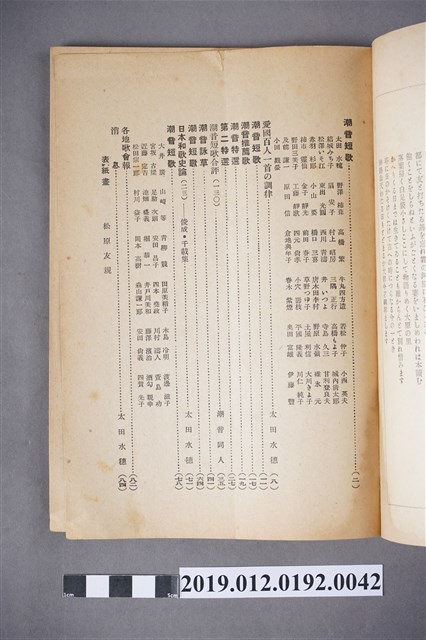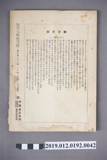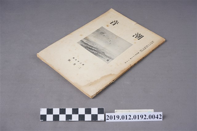 本文物為昭和18年(1943年)2月1日所發行的潮音雜誌第29卷2月號,以3隻鶴飛越浪潮的畫為其封面。全書以日文書寫,內容為短歌、詩歌等,在末頁,則附有相關出版社的活動訊息及相關投稿的規約。潮音雜誌的出版社為潮音社,其編輯兼發行人為太田貞一,其定價為金50錢,而朝鮮、臺灣等外地則為金55錢。 期刊被命名為雜誌,雜誌一詞,其起源有二,有一說為中國古代紀載傳說、故事等的筆記,所產生的古詞語,在1862年倫敦傳教會的麥嘉湖創辦《中外雜誌》,其英文名為Chinese and Foreign Miscellany