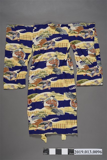 本文物為顏色豐富之和服,上畫有龍宮之圖案,其中也包含海浪、白鳥、女子。
