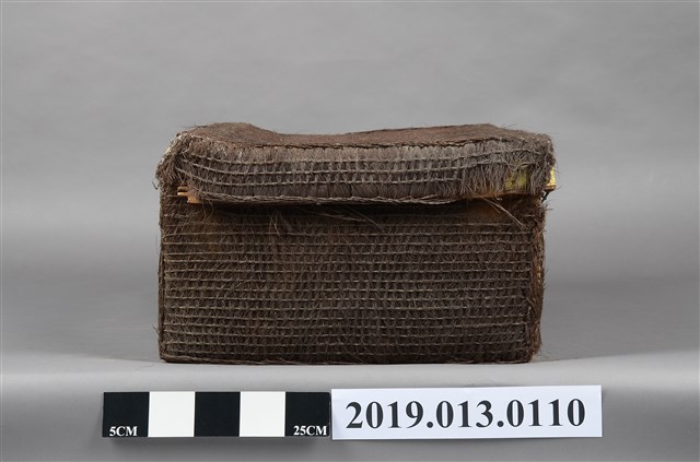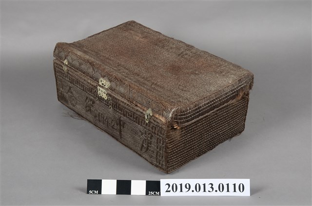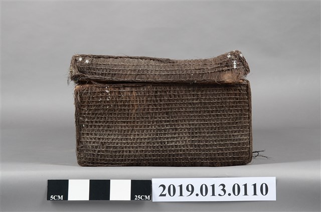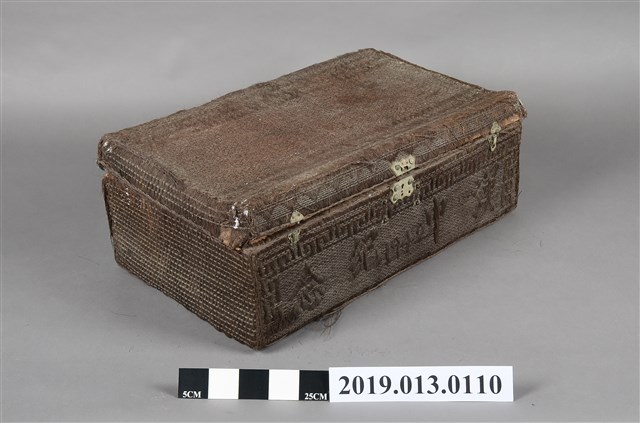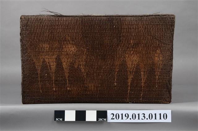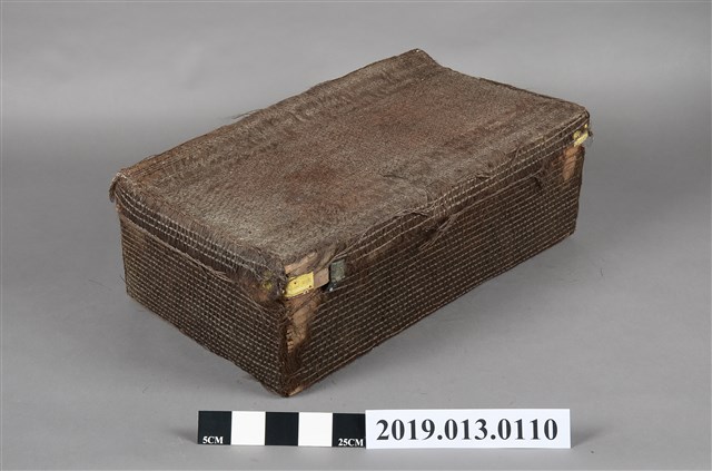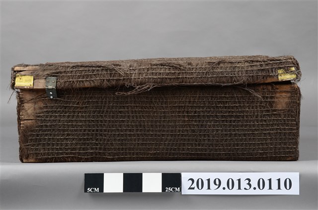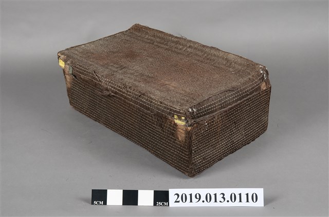 本文物為以椰棕製成的行李箱,並附有金屬鎖頭,但部分以損壞,在其外觀為深棕色,並擁有簡單的圖案。