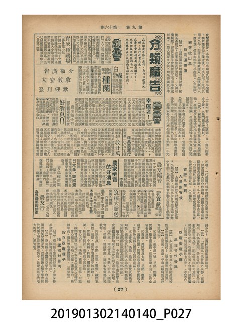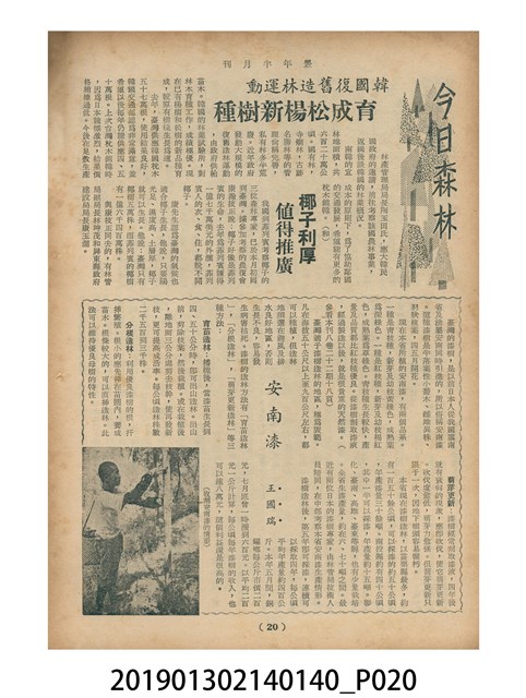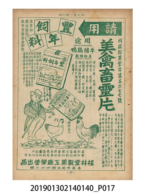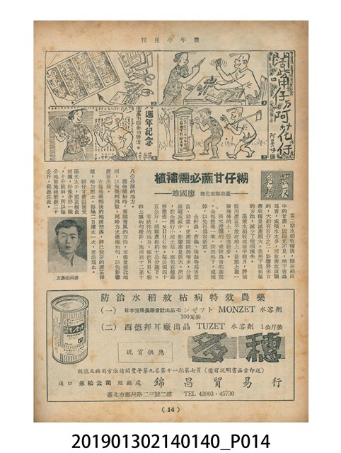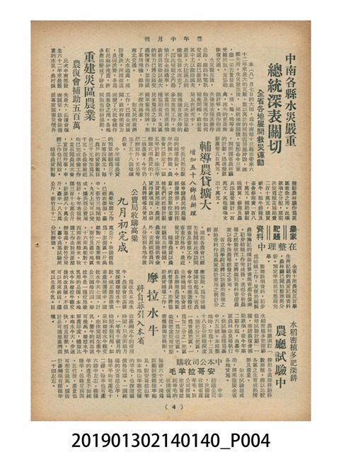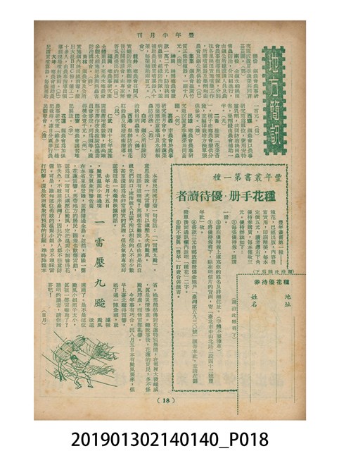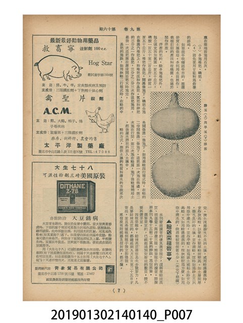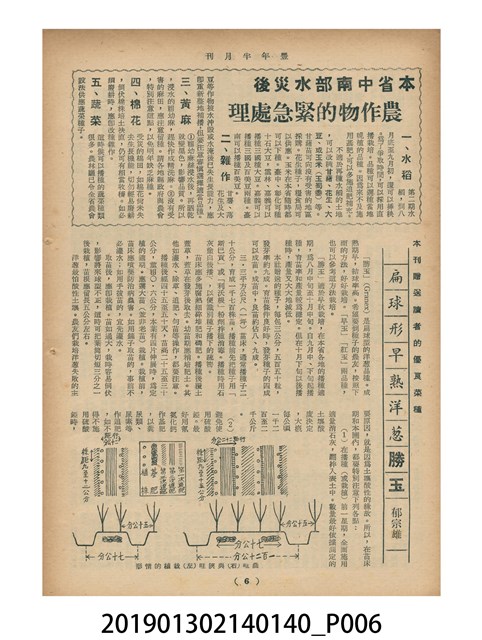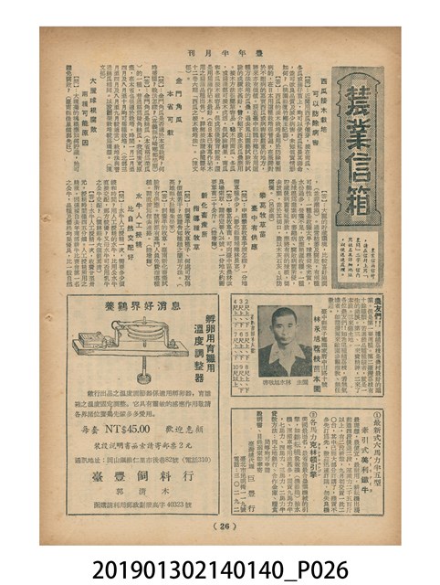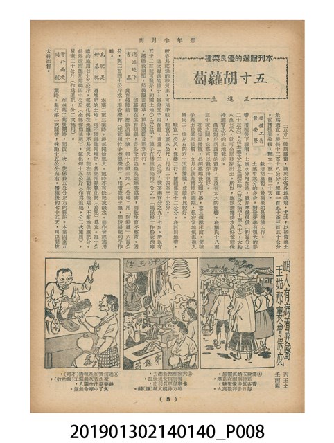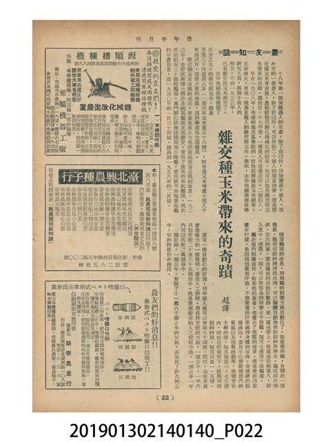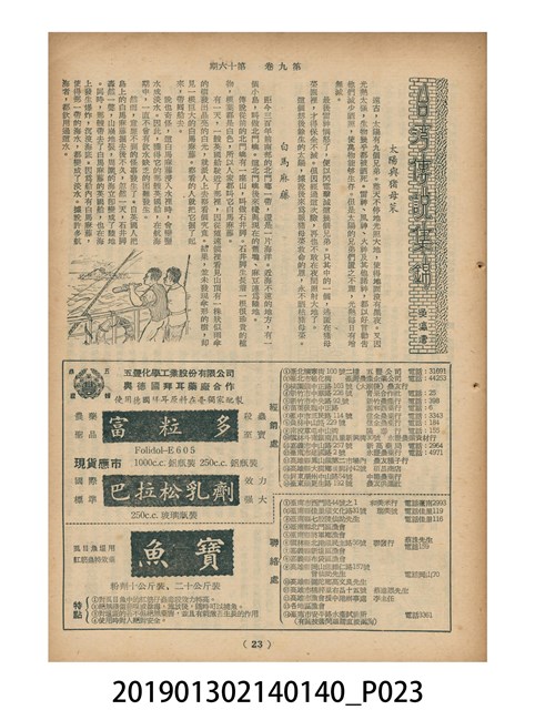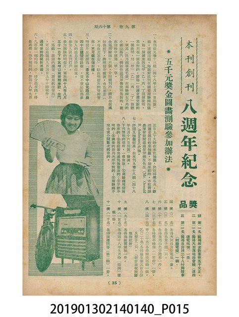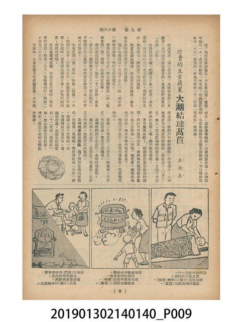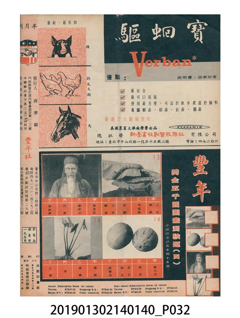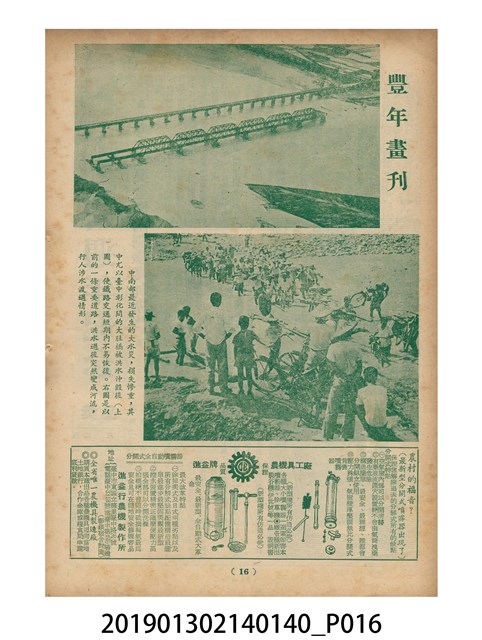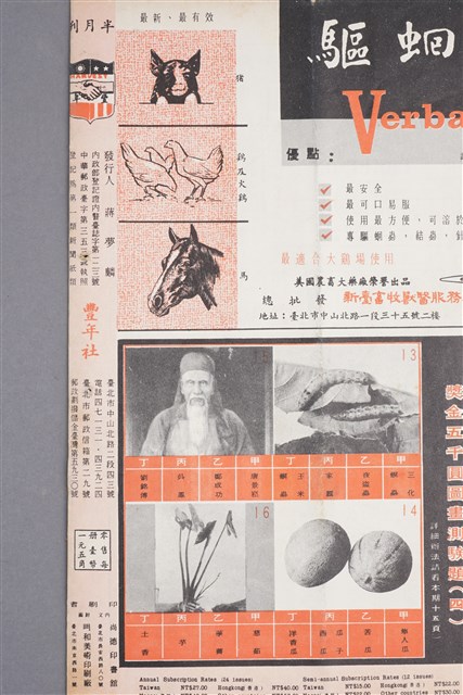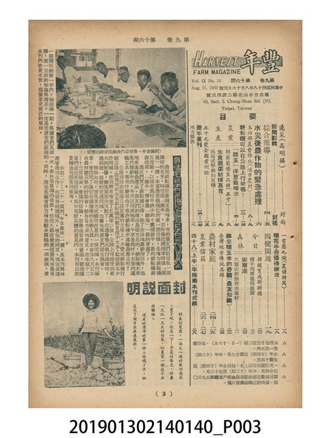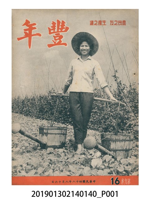 本文物為民國48年(1959)8月16日發行的豐年雜誌第九卷第十六期,其封面為一婦女澆水之照片,雜誌內容包含各項農業知識、民間故事、家庭衛生保健知識等專欄。豐年雜誌為民國40年(1951)創立的豐年社,於創設同年7月15日出版,為半月刊,為專業的農業雜誌,發行宗旨是「農民之友、生產之道」,主要為介紹農業新知,改進農業生產,進而提高農民所得。後來由於經濟結構及農村社會的改變,「豐年」的內容也隨之調整,除強調生產外,也注重生活與生態的問題。其出版獲得美國經濟合作總署中國分署、美國新聞處及農復會的支持,最初採取