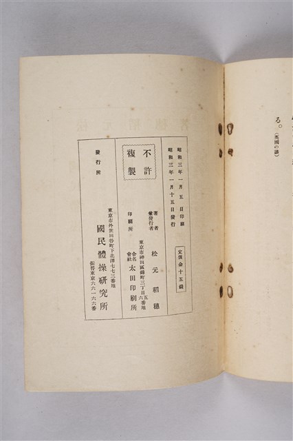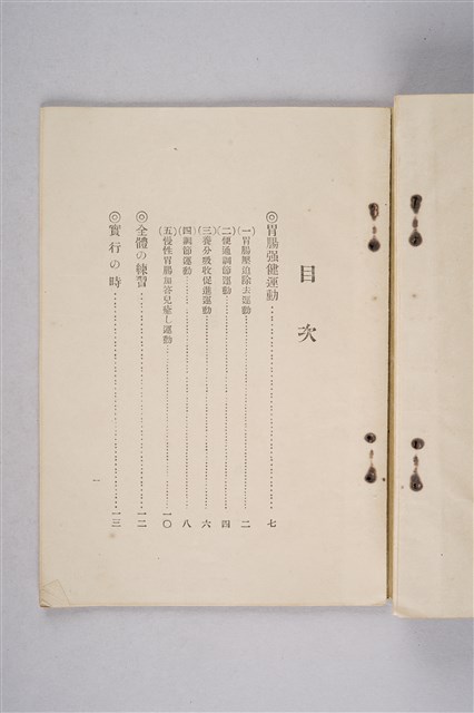 該物件為1928年(昭和3年)國民體操研究所發行的體操書籍《二分兼體操 胃腸の強健法》,作者為松元稻穗(亦為發行者)。內容包含有關胃腸保健運動介紹、實行的時間、心得與效果等,以推廣體操。