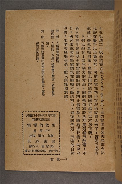 該物件為世界書局於1955年(民國44年)3月所出版的小冊子。內容刊載取自國外介紹雷電的科學文章,由張金銓和張在賢譯成中文。