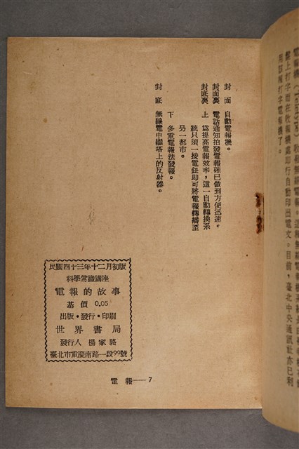 該物件為世界書局於1954年(民國43年)12月所出版的小冊子。內容刊載取自國外介紹電報的科學文章,由張金銓和張在賢譯成中文。