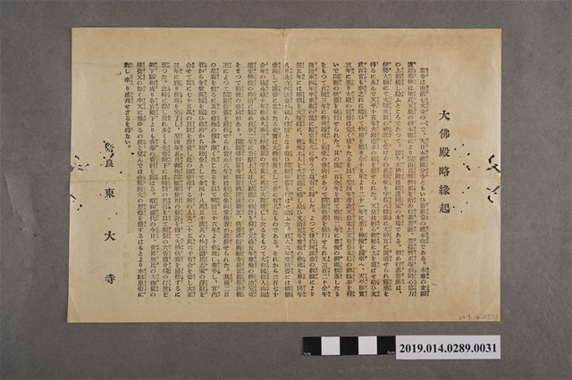 該物件為奈良東大寺大佛殿簡介,內容包含建築物數量、尺寸、佛像尺寸,以及該寺的歷史。