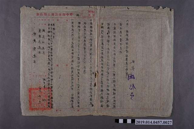 該物件為新化初中校長闕鎬曾發給營建商的催促公函。內容表明,學校與該營建商於1953年(民國42年)3月13日簽約,由該營建商負責學校工作室建築工程,而學校已預付百分之八十之建築費;唯,該營建商拖延工程一個月又十天,嚴重影響校方教學活動。若該營建商未於同年5月26日以前完工,學校將依照工程合約第十七條之規定索討賠償。