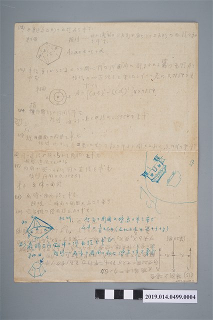 該物件為日治時期所使用的表格「採血名簿甲號 第二十三號」,內容包含地址、戶主與家庭成員姓名、年齡、基番號、月份、戶主トノ續柄(戶主對戶內人口的稱謂)、既往症(病歷)等。唯該表格僅填寫部分地址,他處均為空白,僅背面空白處寫有算數習題。