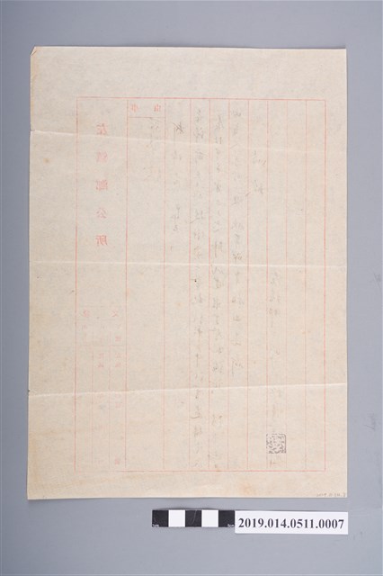 該物件為左鎮鄉公所寄給捐贈者柯瑞吉的信件,原裝在物件B183-5中。內容為:「柯瑞吉先生:台端前參加技術員工登記經轉奉社會處肆壹辰養社甲字第六五五八O代電准予登記給証,請予近日內有人來所之便,順帶印章領回為荷。」