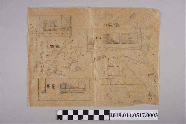 該物件為一張繪有室內設計圖的描圖紙,其上寫有算式。原夾於物件B189「柯瑞吉筆記簿」中。