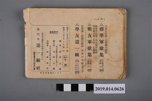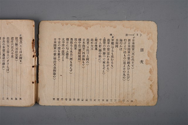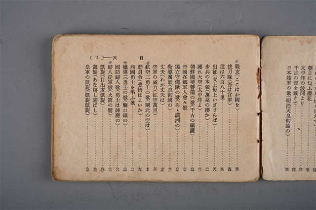 該物件為第一線社於1937年10月10日發行的軍歌集《歌へ軍歌を》,編者為志村文藏。內收錄41首軍歌,如日本陸軍、皇御國、千人針、戰友、帝國在鄉軍人會會歌、婦人從軍歌等。每首歌曲均附樂譜、歌詞,以及作曲作詞者姓名。最末頁附該出版社其他出版品之廣告。