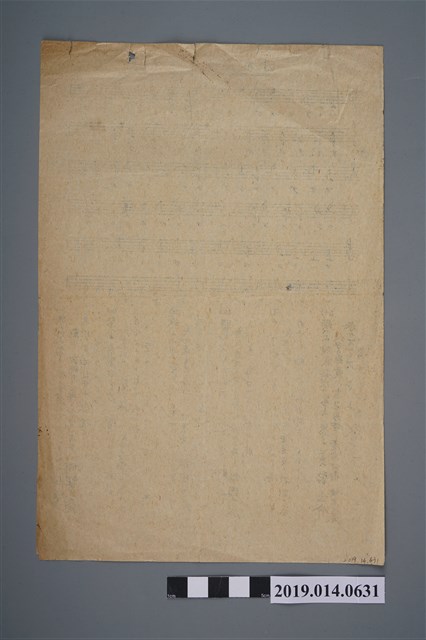 該物件為日本產業體操歌之歌譜。該歌譜分成兩部分,上半部為歌譜及片假名歌詞,下半部為以漢字和平假名寫成之歌詞。歌詞內容大致為盛讚國家,高呼發展產業以報國。