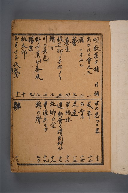該物件為線裝歌本《唱歌集》,由於該書未有出版資料頁,故不知編者及出版者。該歌本收錄莫約165首歌曲,如港、故鄉、祝歌、小菊、雲雀、進軍等歌曲。