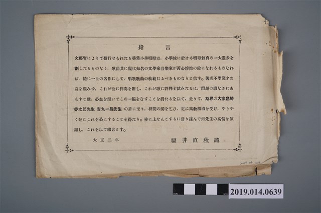 該物件為東京共益商社書店出版的小學音樂教材「尋常小學唱歌伴奏樂譜歌詞評釋 第四學年用」的殘頁,僅存作者福井直秋為該書所撰之序言,以及書本標題。另,其上印有柯天送之紅印,故推測該書原物主屬柯天送。
