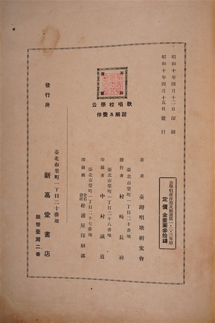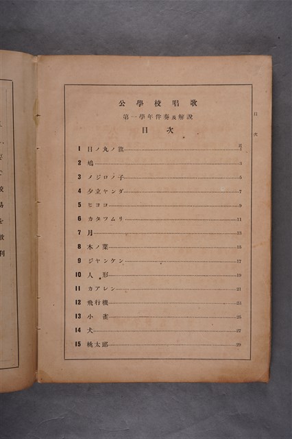 該物件為1935年(昭和10年)4月15日新高堂書店發行、臺灣唱歌研究會編著的音樂教材「公學校唱歌 伴奏及解說」,供授課教師使用。該書可供三個學年使用,每一學年各有15首歌曲,共收45首。每一首歌曲均有歌譜、鋼琴伴奏譜、教授摘要、歌詞、歌詞要旨及語釋等六個部分,協助教師授課。
