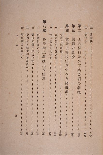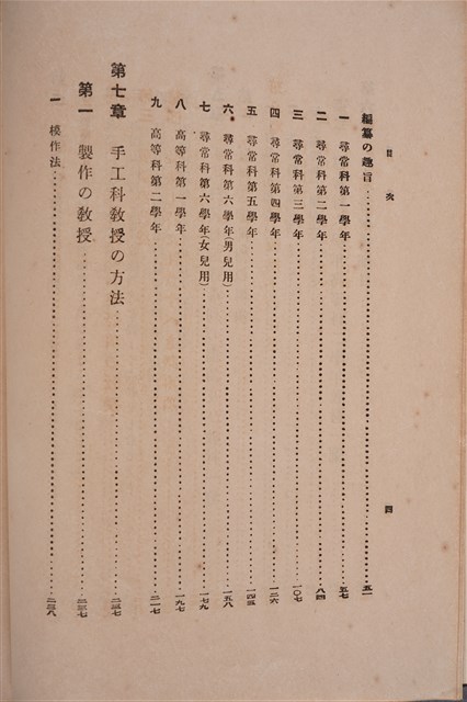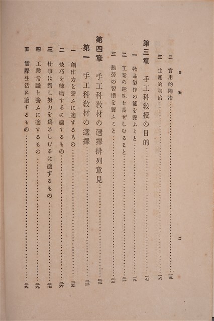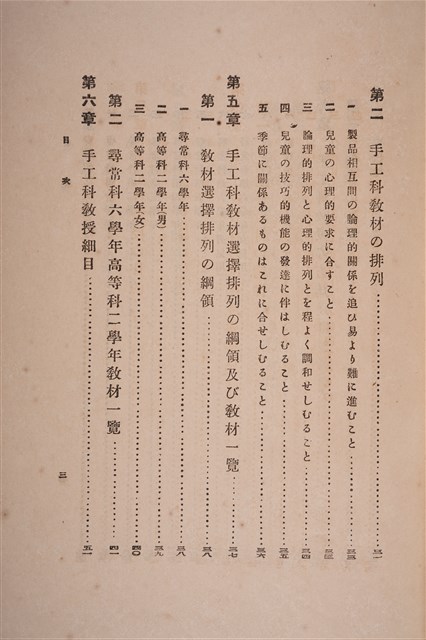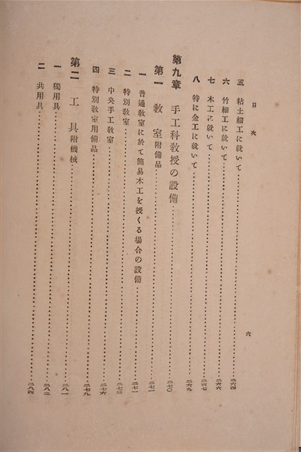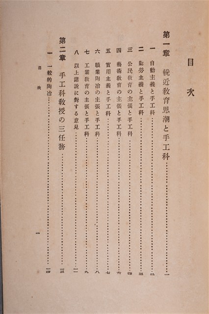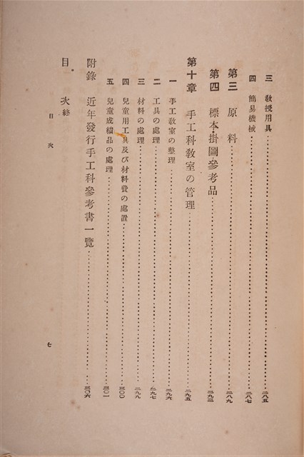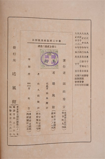 該物件為1938年(大正13年)5月10日培風館再版的《新手工科教材及教授法》(初版日期:1920年9月17日),作者為岡山秀吉。全書共10章,標題分別為:晚進教育思潮和手工科、手工科教授の三任務、手工科教授の目的、手工科教材の選擇排列意見、手工科教材の排列、手工科教材選擇排列の綱領及び教材一覽、手工科教授細目、手工科教授の方法、各種細工教授上の注意、手工科教授の設備、手工科教室の管理。該書詳列許多手工科教學的細節,可供授課教師參考、備課。