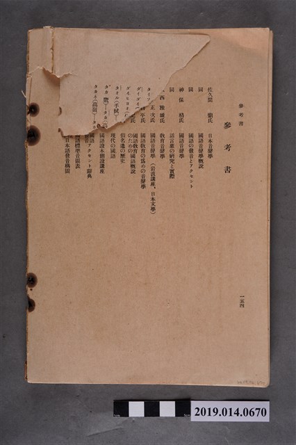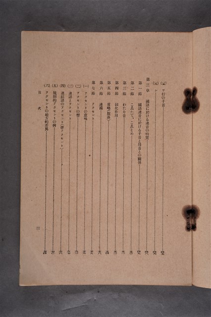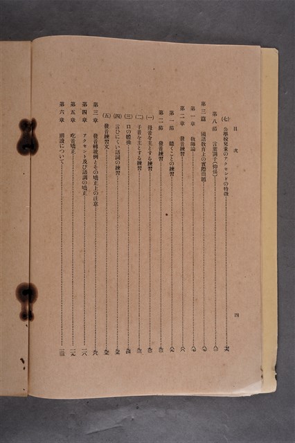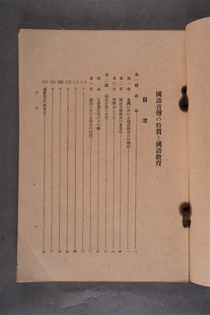 該物件為臺中師範學校教諭木村萬壽夫所著的《國語音聲の特質と國語教育》,唯該書出版資料頁缺漏,故無法得知詳盡出版資訊(僅存第1至154頁)。全書分成三篇:緒論、國語音聲の特質、國語教育上の實際問題。第一篇闡述臺灣國語教育的特殊性、重要性,以及標準語和方言之間的關係;第二篇討論國語發音的特性;第三篇介紹發音練習方法與矯正、發音的注意事項、音韻的變遷等。該書籍不僅可做為史學材料,更能提供豐富的語音學資訊。該書封面寫有「虎頭埤分」之簽筆字跡。