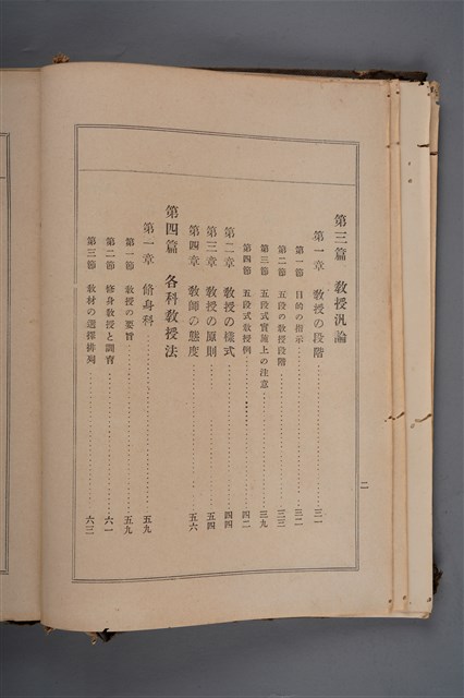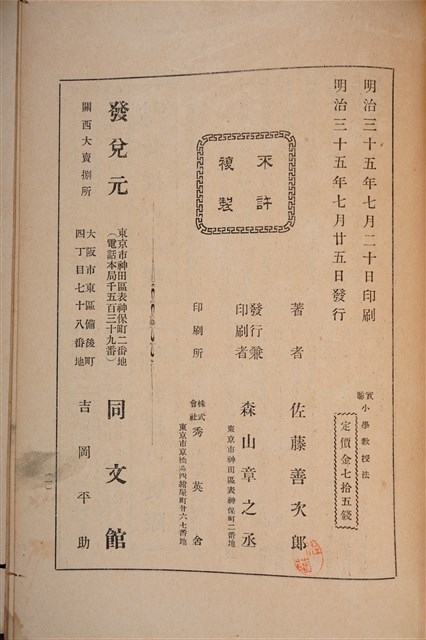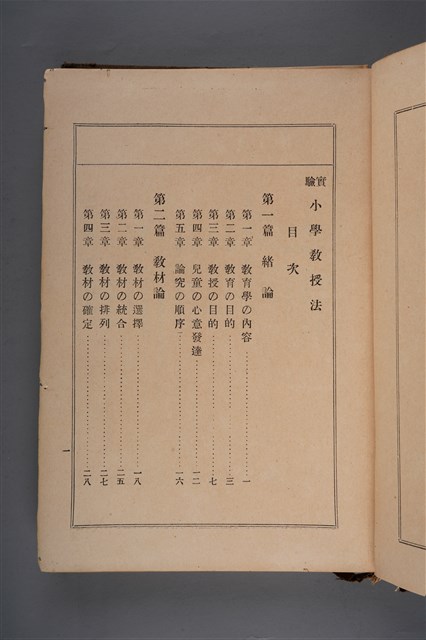 該物件為1902年(明治35年)7月25日東京同文館發行的《實驗小學教授法》,作者為佐藤善次郎。全書共4篇:緒論、教材論、教授汎論、各科教授法。第一篇闡釋教育理論,第二篇講述教材的選擇、統合等實際使用之問題,第三篇介紹教授的原則、方式和態度,第四篇直接針對各科的教授法進行細部討論考,可作為師範學校教科書或供教師參。