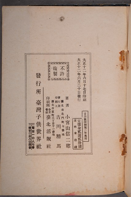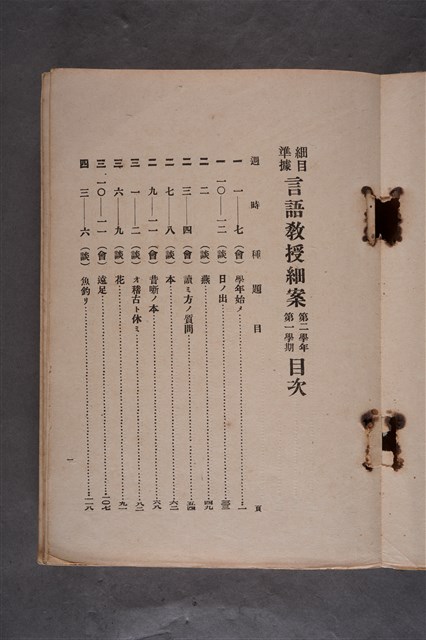 該物件為1923年(大正12年)6月20日臺灣子供世界社發行的《細目準據言語教授細案 第二學年第一學期》,作者為小宮山信二郎。該書依照週次、時間規劃課程,每次的課程均有題目、教材、目的、教法、備考等五部分,供學校教師備課使用。
