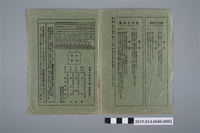 該物件為1929年(昭和4年)12月20日國民體操研究會再版發行的《國民體操圖解》(初版日期為1924年5月5日),作者為松元稻穗。該物件夾有三張體操圖,但僅「國民體操圖解 第一表」為該物件之原表,另外兩張「日の丸體操」可能為原物主所夾入。所封面寫有「斗六郡 劉啟佑」等字。