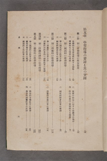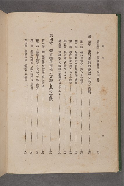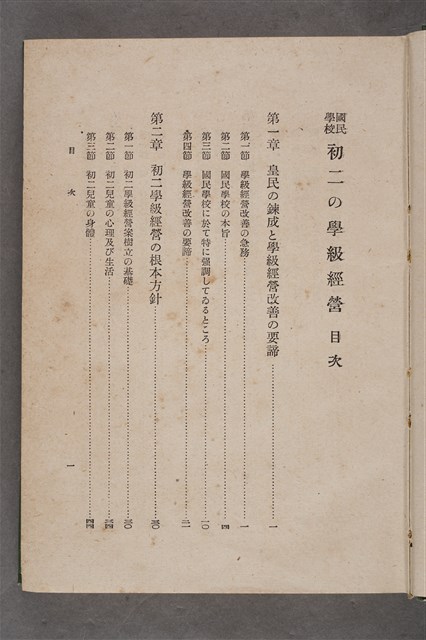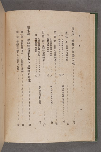 該物件為1941年(昭和16年)10月25日晃文社再版發行之《國民學校初二の學級經營》,作者為廣島高等師範學校前訓導桑原理助。全書分成七章,內容包含培育皇民與改善學校經營、初二學級經營的根本方針、生活訓練、體育衛生指導、學習指導、經營的具體策略、教師的訓練等。該書封面為綠色。