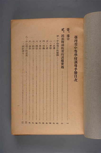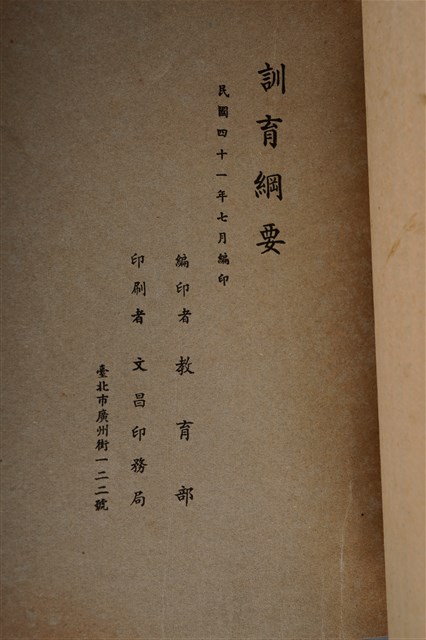 臺灣省教育聽出版《臺灣省中等學校訓導手冊》、《怎樣實施公民訓練》、《怎樣實施生產訓練及勞動服務》、《怎樣實施作業指導》及教育部出版《訓育綱要》