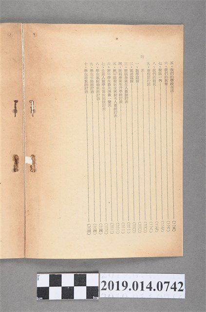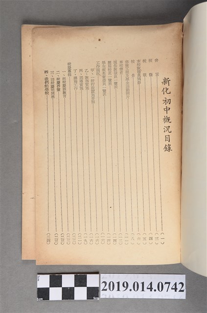 該物件為1960年(民國49年)5月6日臺南縣立新化初級中學發行的《新化初級中學概況》,內容包含校徽、校歌、校景、修建工程及學生活動照片、校史、現任教職員一覽表、歷屆校長一覽表、學生家長會委員一覽表、學校工作概況、校慶專輯(有關校園之文章9篇:祝校慶談教育、校慶抒懷、迎校慶勉同學、我們的學校、我們的校園生活、我們的教室、校園一角、我們的級長、春假旅行記)、有關學生之各式統計表及學校教學、圖書設備統計表。