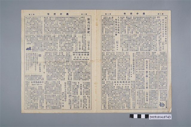 該物件為新竹縣私立義民中學大隊發行的校刊「義中青年 第2期」,發行日期為1956年(民國45年)6月10日。該校刊共4版,內容包含學校獲得教育廳補助的消息、學生活動消息、團物動態、關於當時政治思想的文章等。