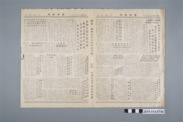該物件為「臺南縣立新豐中學校刊 第103期」,發行日期為1963年(民國52年)3月1日。該校刊共4版,內容包含關於批判中國共產黨的「補充教材」、余校長揭示的努力方針、校務革新概況、學生獲獎報導、校務及學生活動報導、五十一學年度第二學期各班級導師暨級會職員一覽表等。