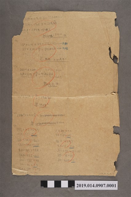 該物件為夾在算術科練習簿中的的算術科測驗卷。從測驗卷的標號重複出現的情況來看,推測該測驗卷被多次使用,可能用於課堂練習,此外其上有紅筆批改痕跡。