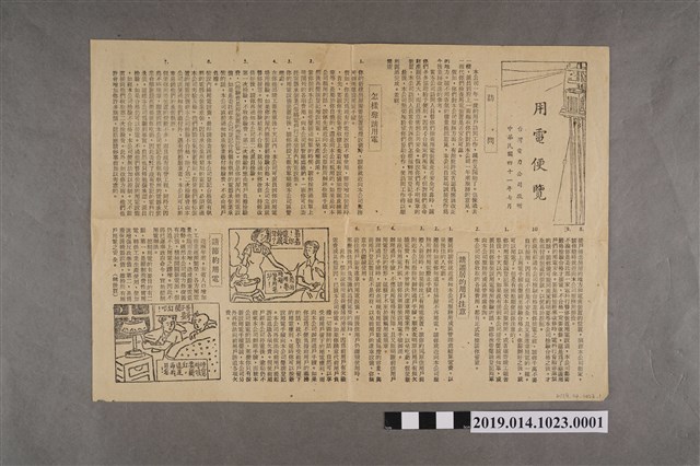 該物件為1952年(民國41年)7月臺灣電力公司印製發送的「用電便覽」,即有關用電的文宣,交導民眾如何聲請用電、節約用電和用電安全。「用電便覽」分成9部分:訪問、怎樣聲請用電、請遷居的住戶注意、請節約用電、假設府上用電設備發生故障!、請注意用電安全!、請注意左列各項,可避免因違章用電的意外負擔、本公司即將設立承裝服務部、兩年來本公司公電及業務之比較。除文字內容,文宣中還附有漫畫插圖,使民眾更容易理解、記住重要事項。