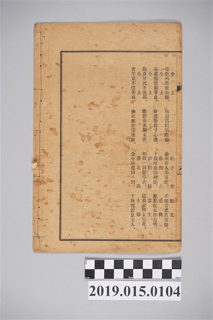 此冊為昭和11年(1936)7月15日,由彰化崇文社發行的《追弔烈婦女》詩集。此詩集為右開線裝紙質鉛板字印刷本,封面泛黃,內容節錄《彰化縣誌(志)》的節烈錄。此冊共書錄汪門雙烈汪劉氏、媳余氏;劉滿姑;朱魯氏、朱群姑;楊顏氏;黃江氏;康吳氏等共8人。此件線裝保存狀況良好無破損,詩集內容反映清治和日治時期傳統女性在地方社會運作的位置與角色,具有時代文化珍稀性。 崇文社創設於彰化縣城南街(今彰化市民族路)的關帝廟內,成立之初為祭祀文昌帝君的民間結社,取「重道崇文」之意。 此社創立於大正6年(1917),約在昭和16年(1941)結束活動。是日治以來的第一個文社,以徵求古文的方式來表現對臺灣社會的參與和關心。舉凡社會風俗的良窳、政治經濟的改革、臺人受教的權益、婦女地位的提昇,均為其所關注的層面