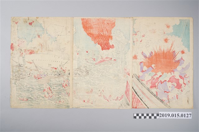 楊齋延一所繪《臺灣溪水激戰之圖》畫作,由橫山良八於明治27年(1894)發行,畫面呈現日軍與臺灣軍民於溪水中激戰之意象圖,共1張影幅。照圖面戰情分析,清兵顯見是戰情吃緊一方,詮釋當時日本如何記錄19世紀末的這場大戰,及對戰爭的宣傳情況。楊齋延(1872-1944),別稱楊齋,明治時期的浮世繪師之一。其作品活躍於1887年至1907年,並以描繪日清戰爭、日俄戰爭等戰役主題浮世繪為主。 此系列浮世繪畫報製作年代在1893-1895年之間,詮釋當時日本如何記錄19世紀末的這場大戰,及對戰爭的宣傳情況。當時絕大多數的製作者並未親歷現場,所描繪的圖像內容多為虛構,並不一定符合事實,為對一般民眾的宣傳文宣,達到與中國相互間的政治宣傳與心理戰。浮世繪圖在日本早期絕大多數為木版畫(多彩),少數為石版畫(單彩),是日本江戶時代盛行的民間藝術,既是裝飾物,又傳遞故事和信息。此種繪圖的製作由畫師、雕師、拓師按順序分工合作完成,從繪畫、刻板到上色,有著非常嚴密的工序,和日本人的性格相同,非常細膩與專業。此系列浮世繪畫報極具歷史意義和收藏價值。 此畫圖為木版畫(多彩),是由三張印刷圖膠黏合成,當時稱為三連錦繪圖。三連錦中的最右邊圖紙右上方有少許汙漬,中間圖繪和最左邊圖繪在接合上有些許上下錯位,無法切合。此三連錦圖繪在漆彩調色方面,有很細微的色差,從海浪色層和天空的顏色呈現上即可看出,但是基本色層都沒問題,此為早期版畫印刷品的缺陷,但不影響此圖的歷史價值。此圖屬1895年乙未之役相關印刷類圖像文獻,已典藏入中央研究院臺灣史研究所後設資料及數位影像,圖像史料具特殊性與珍稀性。