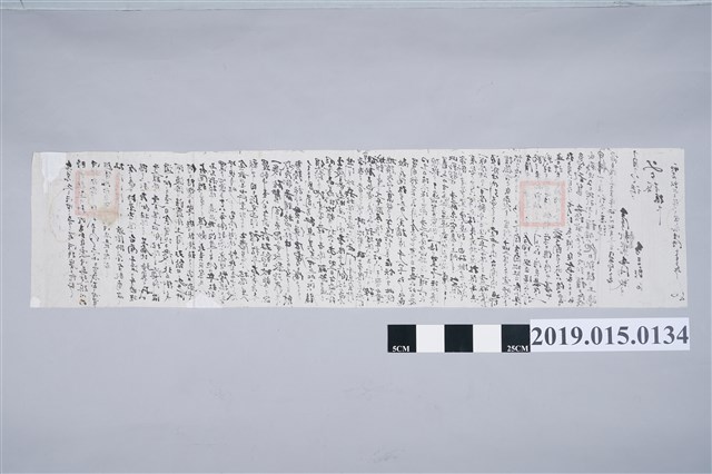 此件為明治28年(1895)乙未之役期間日軍屬員家書,最後落款時間為10月18日,寫信者署名○(待辨識)三郎,對象為其父親,寫信地點在嘉義白沙墩。從書信中第6、7行提到「我々第二联隊之第一大隊」,以及第16行「余ハ前迎小行李隊トシテ」等訊息來看,寫信者的身分,可能是隸屬於近衛師團第二聯隊第一大隊的軍屬,即受僱於軍方、負責處理各類勤務的人員,並非正規軍人,他在「小行李隊」中,可能是隨軍攜帶彈藥、裝備等物之人。信中內容出現了北斗街的大河、清羅街(應指西螺)、土庫、雙溪口、嘉義城攻擊、鹽水港等行軍作戰過程。 此件書信內容尚待進一步日文翻譯解讀,充分解讀後,應可進一步了解1895年乙未之役的現場細節。此件書信前、後各蓋有滿漢文「臺南府印」朱文方印,緣由待考。此件屬1895年乙未之役書信類文獻,具有史料珍稀性。