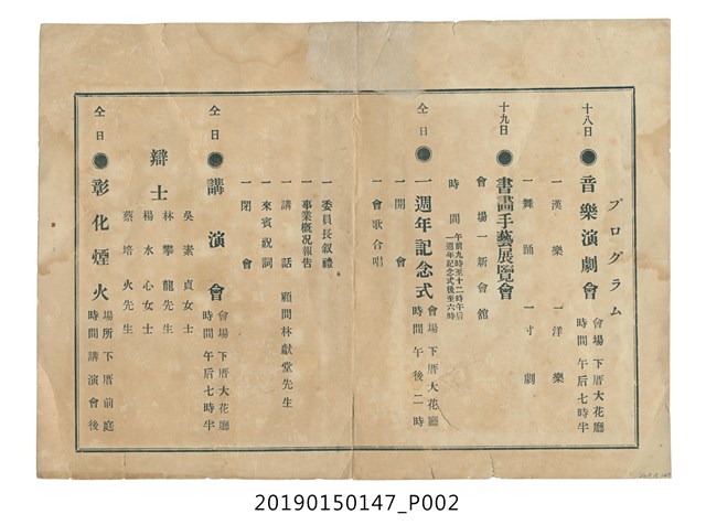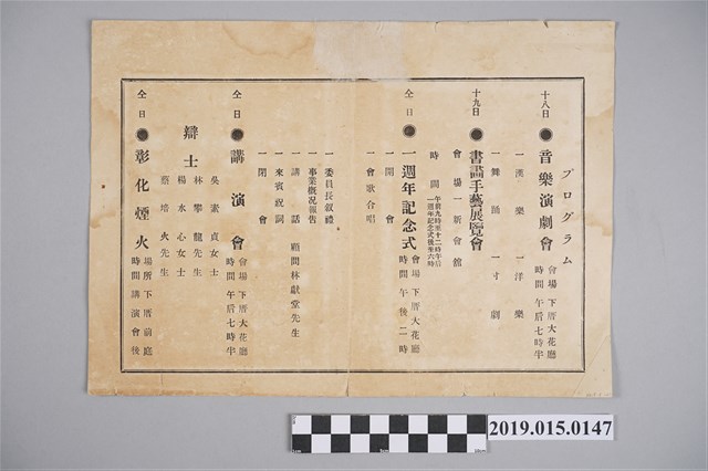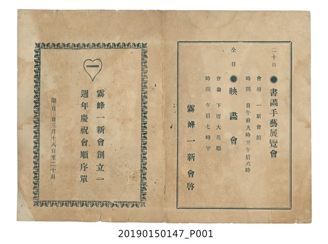 本文件雙面印刷,對折後分為四大區塊: 封面有一紋飾方框,中央為文件標題:「霧峰一新會創立一週年慶祝會順序單」,上有霧峰一新會心型標誌,左方記活動日期:期日自三月十八日至二十日,但該排日期文字被劃除,原因不明。 內頁列出慶祝會共三天之活動行程,十八日舉行音樂演劇會,內容有漢樂、洋樂、舞踊(日本舞)以及寸劇(短劇)。十九日的內容較豐富:主軸「一週年紀念式」的行程也有詳細表列:開會、會歌合唱、委員長敘禮、事業概況報告、林獻堂先生講話、來賓祝詞與閉會。同日並舉行書畫手藝展覽會以及講演會,辨士則有吳素貞女士(吳帖,林資彬妻,彰化人)、林攀龍先生(一新會創辦人)、楊水心女士、蔡培火先生擔任。講演會後還有彰化煙火施放。二十日有書畫手藝展覽會以及映畫會。由上述活動可見,當時名人雅士的休閒興趣已明顯受到日本文化帶來的現代化影響,出現近代劇場、洋樂等娛樂活動。一新會一週年的慶祝活動為期三天,頗為盛大,也能見到數位女性成員在霧峰一新會享有舞臺並十分活躍,如吳素貞及楊水心受邀擔任講演會辨士,此現象當與霧峰一新會特別重視婦女參與有關。一新會於1932年創立,此文件為一週年慶祝會時程,推測為1933年之文物。