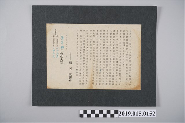 2019.015.0152 民國36年1月楊天賦致蔡年驂捐款催款文