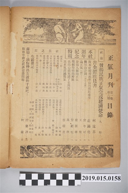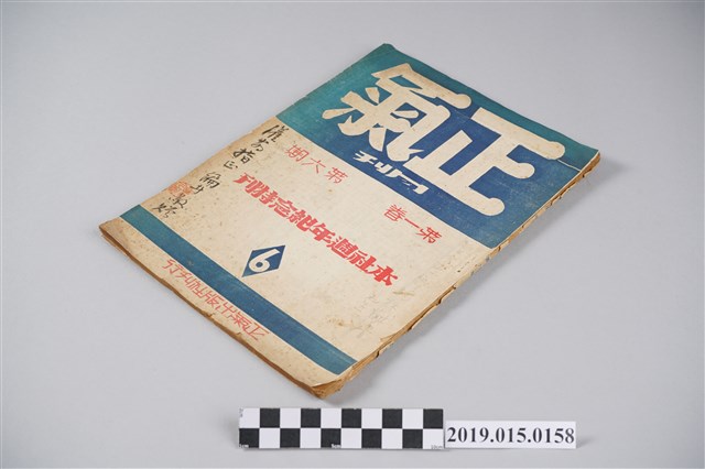 《正氣月刊》是正氣學社的機關刊物。正氣學社前身為「正氣出版社」,於1946年3月擴大規模,改組為「正氣學社」。「正氣學社」社長為警備總部參謀長柯遠芬,屬警備總部的外圍組織。該社之《正氣半月刊》於1946年4月發行,至7月先後發行5期,至同年10月改為《正氣月刊》。 〈正氣月刊徵稿簡章〉記載「本刊以闡揚三民主義,宣傳國策,發揚正氣,並對國內外政治、經濟、軍事、文化諸問題,加以理論與實際之研究,以供社會人士之參考為主旨」。該刊第1卷第2期為「雙十節特輯」、「臺灣省第一屆運動大會特輯」、第1卷第3期為「國民大會特輯」、第2卷第2期為「臺灣『二二八事變特輯(下)』」。本件為第1卷第6期正氣月刊週年特刊,封面有手寫「灌園指正編者敬贈」,應該是編者曾今可送給林獻堂,名人酬贈,別具意義。