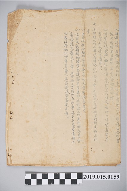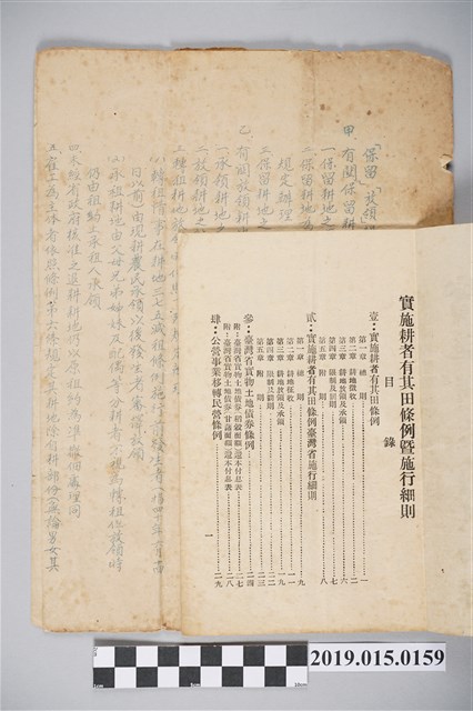 本件係實施耕者有其田條例暨施行細則之手寫版本及刻鋼板本。時間是1953年4月,標題「實施耕者有其田條例暨施行細則」為沈時可所題。沈時可(1908-1994)係江蘇海門人, 東吳大學畢業,入中央政治學校地政學院第2期。 1946年任臺灣省地政局局長。 1949年草擬「土地改革條例」,後來並與美國林肯學會合作,在臺灣省桃園縣成立土地改革訓練所,並任該所執行秘書。本件可說是臺灣土地改革的史料之一。