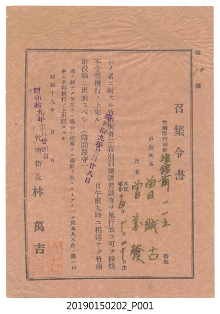 2019.015.0202 昭和19年5月24日竹南街長林萬吉給曾義發召集令書