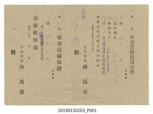 2019.015.0203 昭和19年11月19日竹南街長林萬吉給王添軍用藁供出通知書