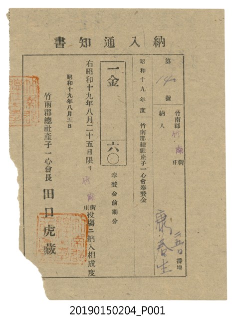2019.015.0204 昭和19年8月5日竹南郡總社產子一心會長田口虎藏給康春生納入通知書