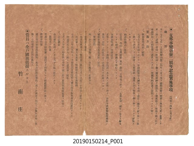 本件屬於日治晚期竹南庄鹽館前王家之部落社會教化政策相關文書其中一件。本件事昭和14年竹南庄「支那事變勃發二周年記念行事實施事項」,除當日家家要懸掛日本國旗外,主要舉辦的活動包括事件紀念日早晨向北祈禱祝皇室昌榮、舉行天皇敕語捧讀式、紀念日正午默禱軍人武運長久等。
