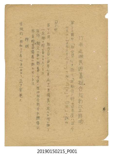 本件屬於日治晚期竹南庄鹽館前王家之部落社會教化政策相關文書其中一件。日本從大正年間積極大力鼓吹國民貯蓄,後來1938年即在大藏省下設貯蓄獎勵局。當時日本政府為增加資金動員,令各地農村組織國民強制貯蓄組合。本件之背景當本於此。鼓勵各庄成立國民貯蓄組合,而竹南庄國民貯蓄組合亦應成立於此時。旋於1938年又修正「竹南庄國民貯蓄組合規約」第13條,進行部分文字修正。其後,1942年以法律第64號公布國民貯蓄組合法,作為戰時資金動員,又是後話。