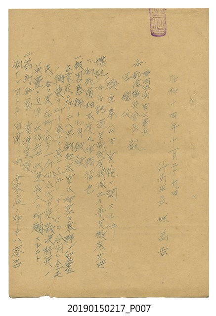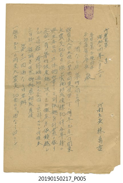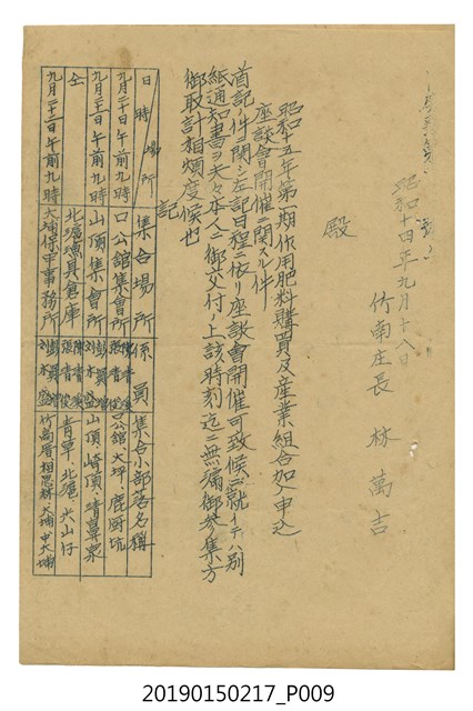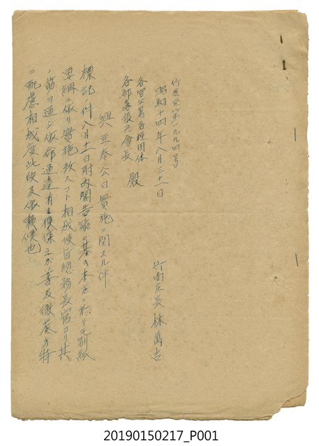 昭和14年8月31日竹南庄長林萬吉給各官公署、各種團體、各部落振興會長公文