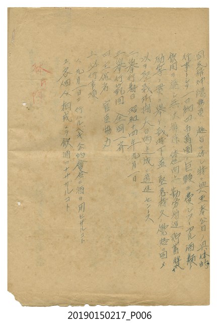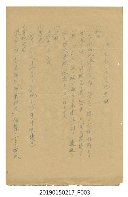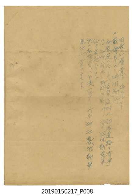 本件屬於日治晚期竹南庄鹽館前王家之部落社會教化政策相關文書其中一件。日本內閣依照國民精神總動員委員會之決議,於1939年8月8日作出決定,並於同年9月1日開始實施,於每月1日訂為興亞奉公日。 是日全體國民必須自肅自省、一心一意為興亞大業奉獻,努力厚植國力。竹南庄長林萬吉為遵照指示,即於8月發「興亞奉公日實施ニ関スル件」函給管內各官署、團體、部落振興會長,貫徹實行。