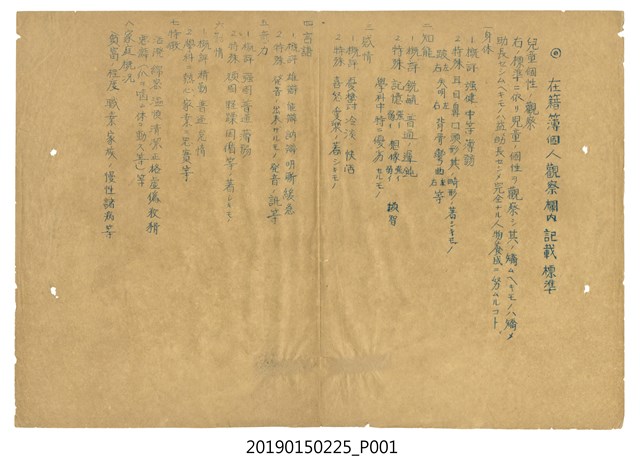 本件屬於日治晚期竹南庄鹽館前王家之部落社會教化政策相關文書其中一件。本件是「在籍簿個人觀察欄內記載標準」,也就是老師填寫學生在籍簿對學童觀察的描述用語,包括對身體、感情、智能、語言、意志力、勤惰、特徵及家庭狀況等8項。
