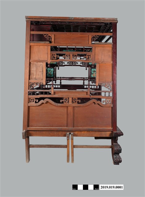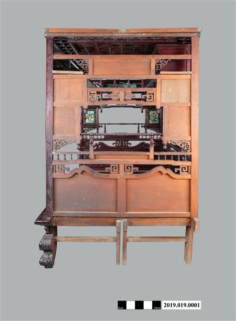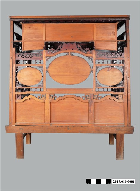 (4) 頂棚:長188cm,寬140cm,中央以一圓形西洋莨苕葉飾為中心,四周以交錯之方格與十字車枳環繞構成鏤空頂框,頂框之上另蓋有兩片木蓋板用以防塵。