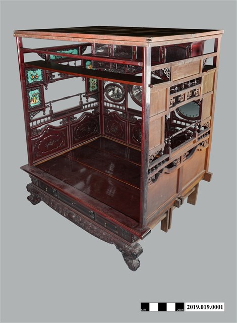 (1) 底座:包括前床架、後床架、後床架連結木插梢2只、床板4片。床座高約64公分,面寬204.5cm,縱深174cm。床腳雕刻成上螭虎下牡丹造型,兩床腳間裝飾西洋捲葉花草雕花牙板裝飾。