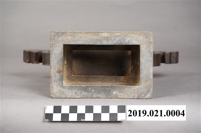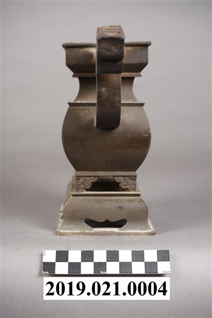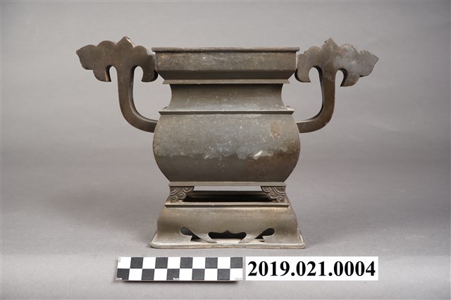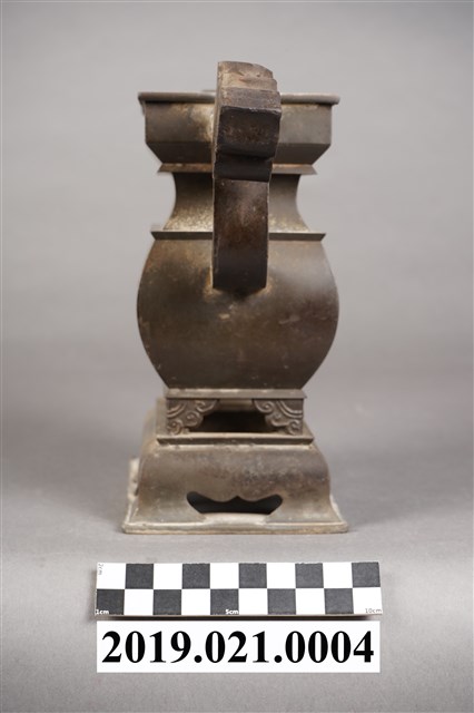 錫製香爐,閩南族群泛稱歷代祖先為公媽,故名公媽爐,又以錫之諧音祈求祖先賜福子孫,造型上四足方形並含座,表面平滑無裝飾,裝有爐耳,象徵子嗣不絕,香火薪傳,底部印有泉發錫鋪印記,與燭臺不同錫鋪。