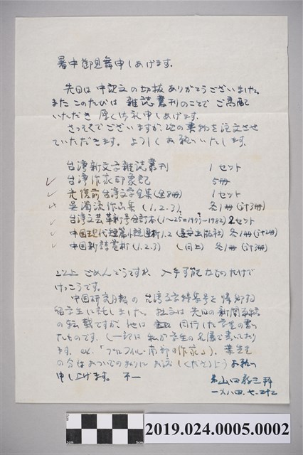 2019.024.0005 山田敬三寄柯旗化信件(1984年7月26日)