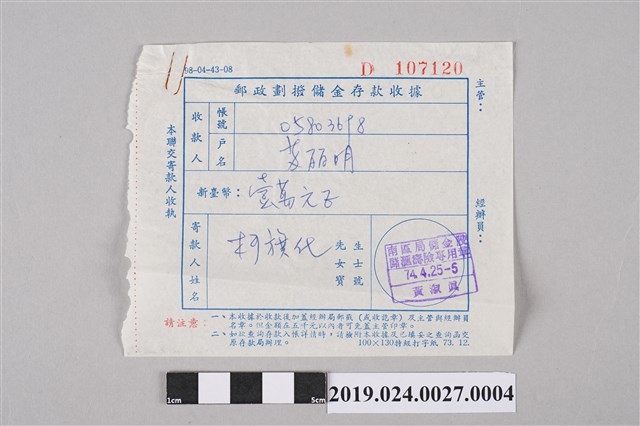 2019.024.0027.0004 柯旗化繳交笠詩刊社年費之劃撥收據