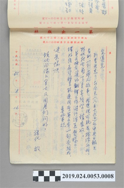 2019.024.0053.0008 1976年8月16日柯旗化寄給獄友吳定遠之信件
